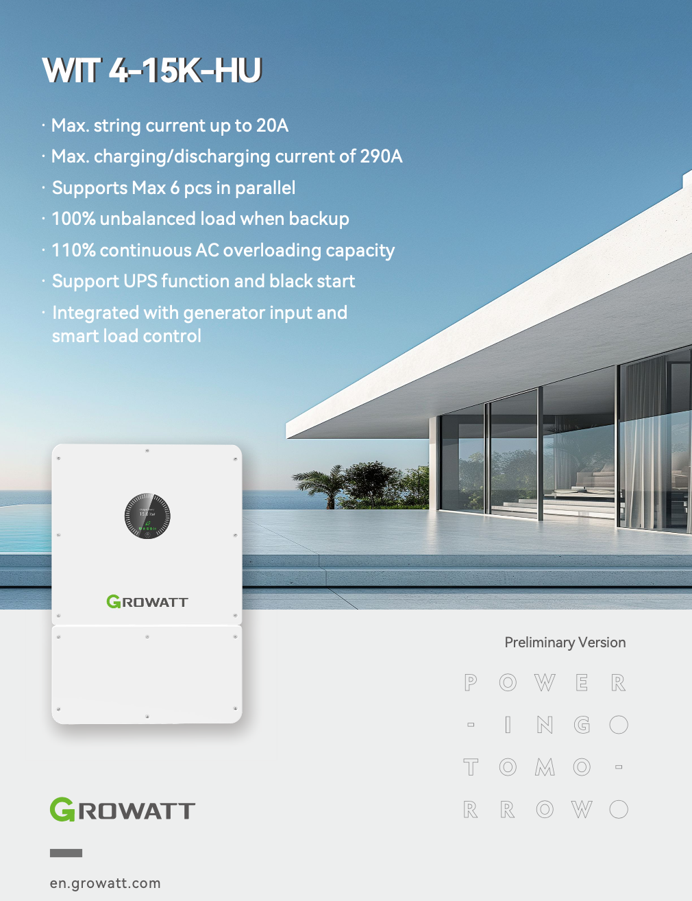 Growatt WIT 4–15K-HU to seria inteligentnych falowników hybrydowych nowej generacji, dedykowanych do instalacji domowych i komercyjnych. Urządzenia te obsługują jednocześnie instalację PV, magazyn energii, zasilanie awaryjne (UPS) oraz współpracę z agregatem. Dzięki wbudowanej funkcji Smart Load Control i szerokiemu zakresowi mocy od 4 do 15 kW, system zapewnia maksymalną elastyczność projektową oraz wysoki komfort energetyczny użytkownika.