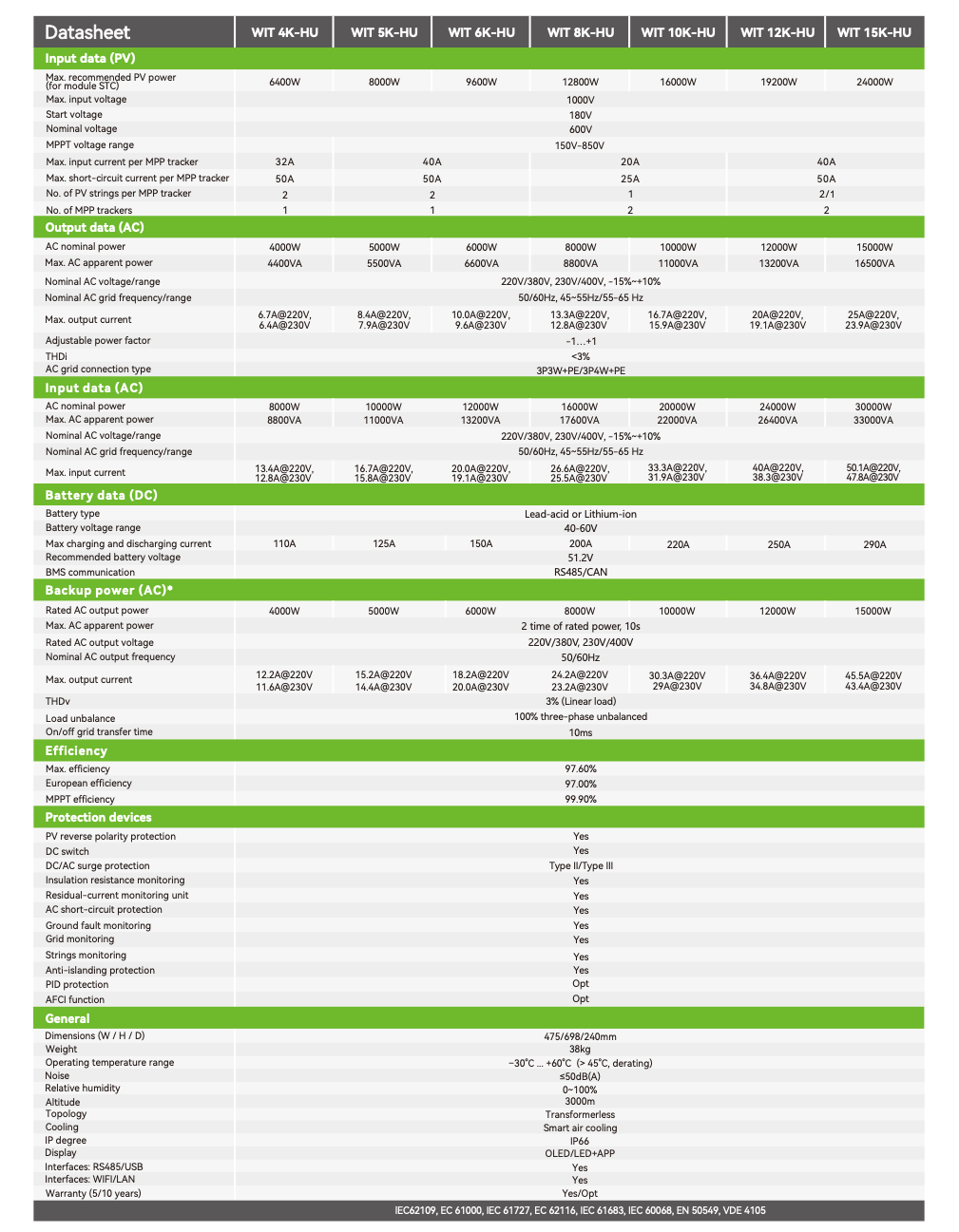 • Maksymalny prąd ładowania/rozładowania: od 110 A (WIT 4K-HU) do 290 A (WIT 15K-HU).