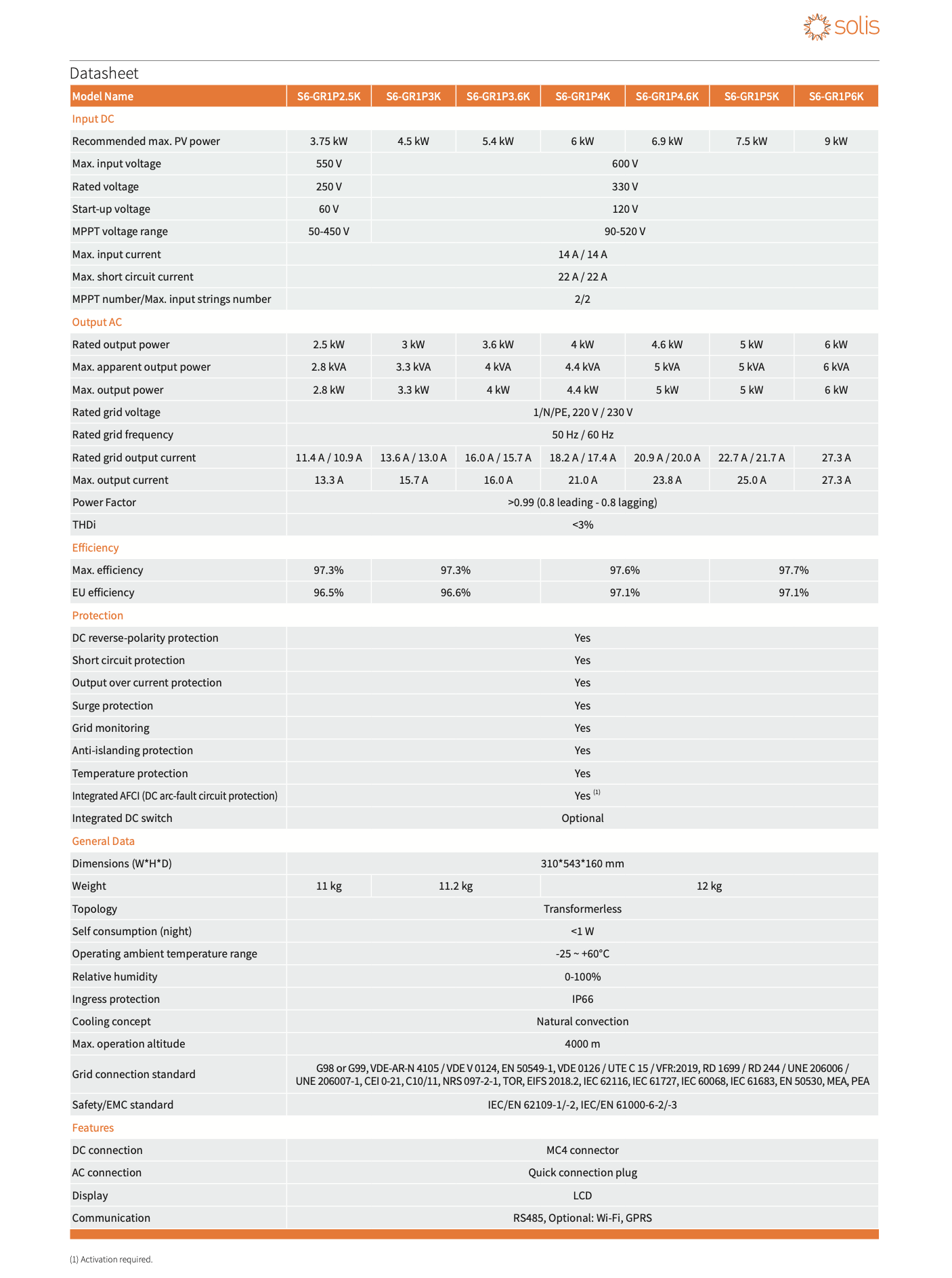 Solis S6-GR1P (2.5-6)K to falownik on-grid, który charakteryzuje się wysoką sprawnością konwersji energii, sięgającą aż 97,3%. Dostępność modeli o różnej mocy znamionowej (od 2,5 kW do 6 kW) pozwala na dopasowanie urządzenia do indywidualnych potrzeb i wielkości instalacji fotowoltaicznej. Dwa niezależne MPPT umożliwiają efektywne zarządzanie energią, nawet w przypadku złożonych konfiguracji paneli PV, np. z różnym nasłonecznieniem lub orientacją. Szeroki zakres napięcia MPPT (od 50 V do 520 V) oraz niskie napięcie rozruchowe (od 60 V) zapewniają elastyczność projektowania systemu i wcześniejsze rozpoczęcie pracy falownika. Zintegrowany menedżer eksportu energii (EPM) pozwala na regulację ilości energii oddawanej do sieci, co jest szczególnie istotne w przypadku lokalnych ograniczeń. Falownik wyposażony jest w kompleksowy zestaw zabezpieczeń, chroniących przed zwarciem, przepięciami, przegrzaniem oraz redukujących ryzyko pożaru dzięki zintegrowanemu zabezpieczeniu AFCI. Solidna konstrukcja ze stopniem ochrony IP66 zapewnia odporność na trudne warunki atmosferyczne, umożliwiając montaż zarówno wewnątrz, jak i na zewnątrz budynku. Szeroki zakres temperatur pracy (od -25°C do +60°C) gwarantuje stabilne działanie w różnych klimatach. Możliwość monitorowania w czasie rzeczywistym poprzez RS485 oraz opcjonalnie Wi-Fi i GPRS zapewnia pełną kontrolę nad instalacją PV i umożliwia szybką reakcję na ewentualne problemy.