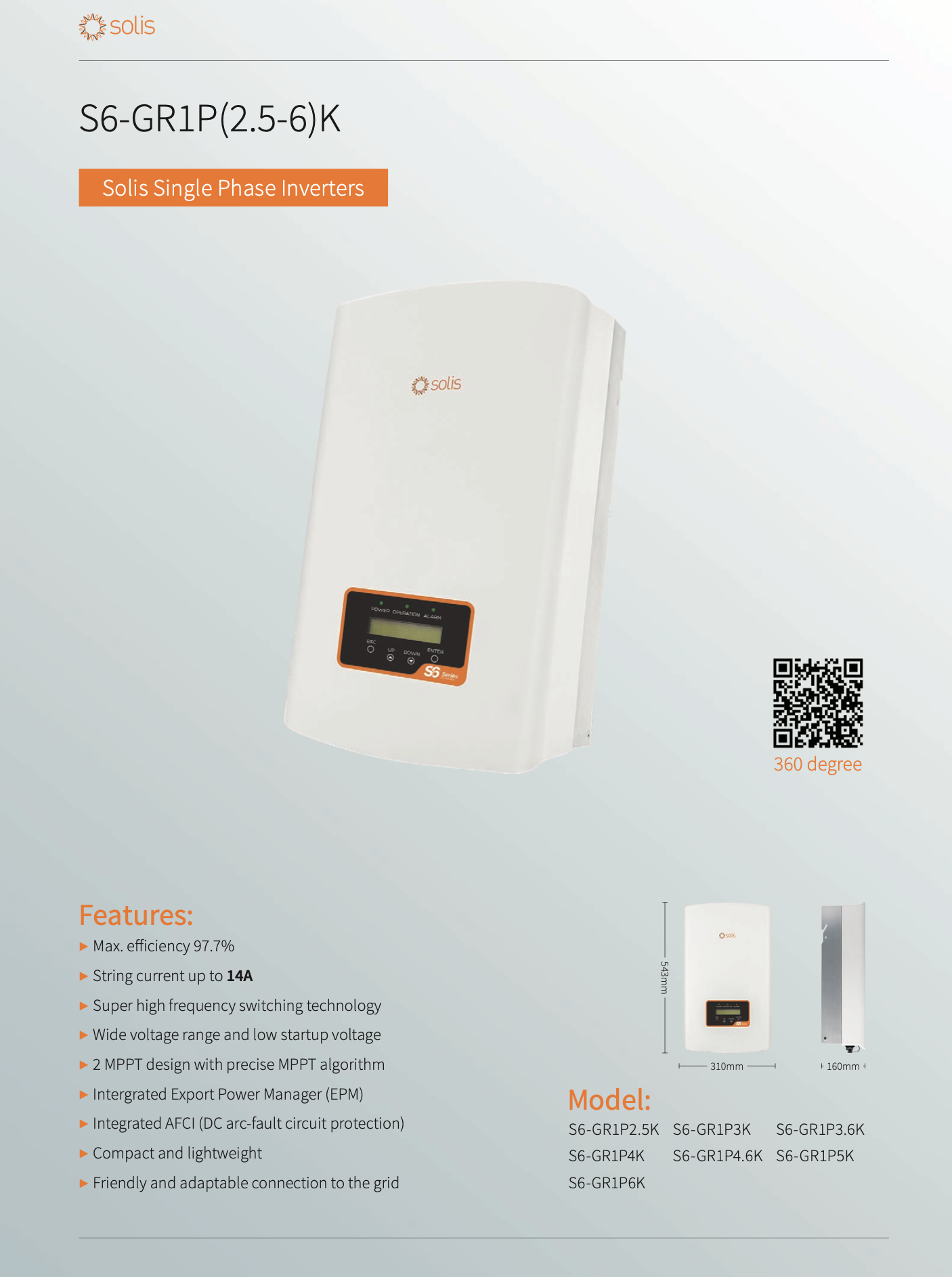Falownik Solis S6-GR1P (2.5-6)K to nowoczesne urządzenie jednofazowe typu on-grid, zaprojektowane z myślą o efektywnej pracy w domowych instalacjach fotowoltaicznych. Wykorzystuje zaawansowane technologie konwersji energii słonecznej, zapewniając wysoką sprawność i niezawodną współpracę z siecią energetyczną.
