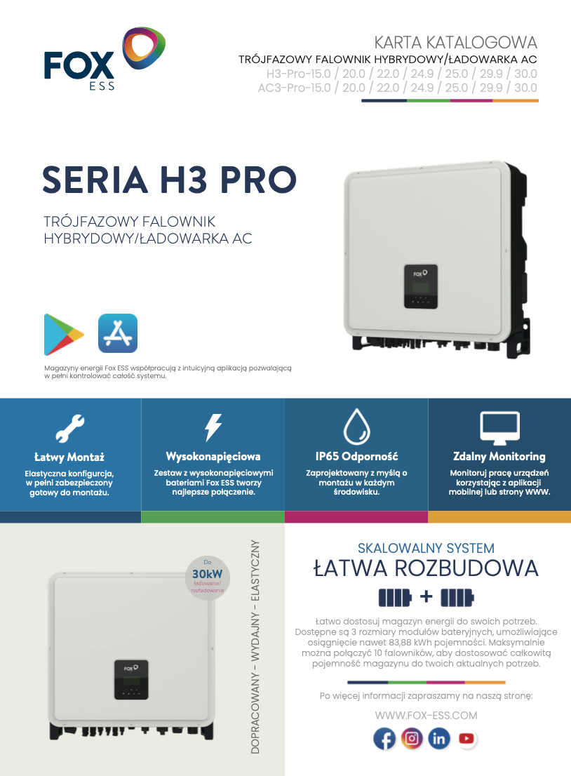 Falownik trójfazowy H3 Pro firmy Fox ESS to zaawansowane rozwiązanie hybrydowe, przeznaczone do optymalizacji pracy systemów fotowoltaicznych. Charakteryzuje się wszechstronnością i wysoką wydajnością, stanowiąc solidną podstawę dla nowoczesnych instalacji.