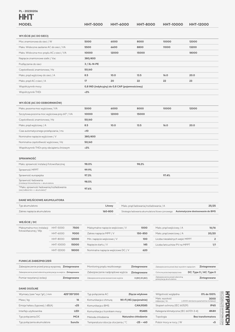 Falownik Hypontech HHT 5-12K to zaawansowane technologicznie urządzenie, zaprojektowane do pracy w instalacjach fotowoltaicznych. Charakteryzuje się elastycznością, wysoką sprawnością oraz niezawodnością, co czyni go odpowiednim wyborem zarówno dla systemów domowych, jak i komercyjnych.
