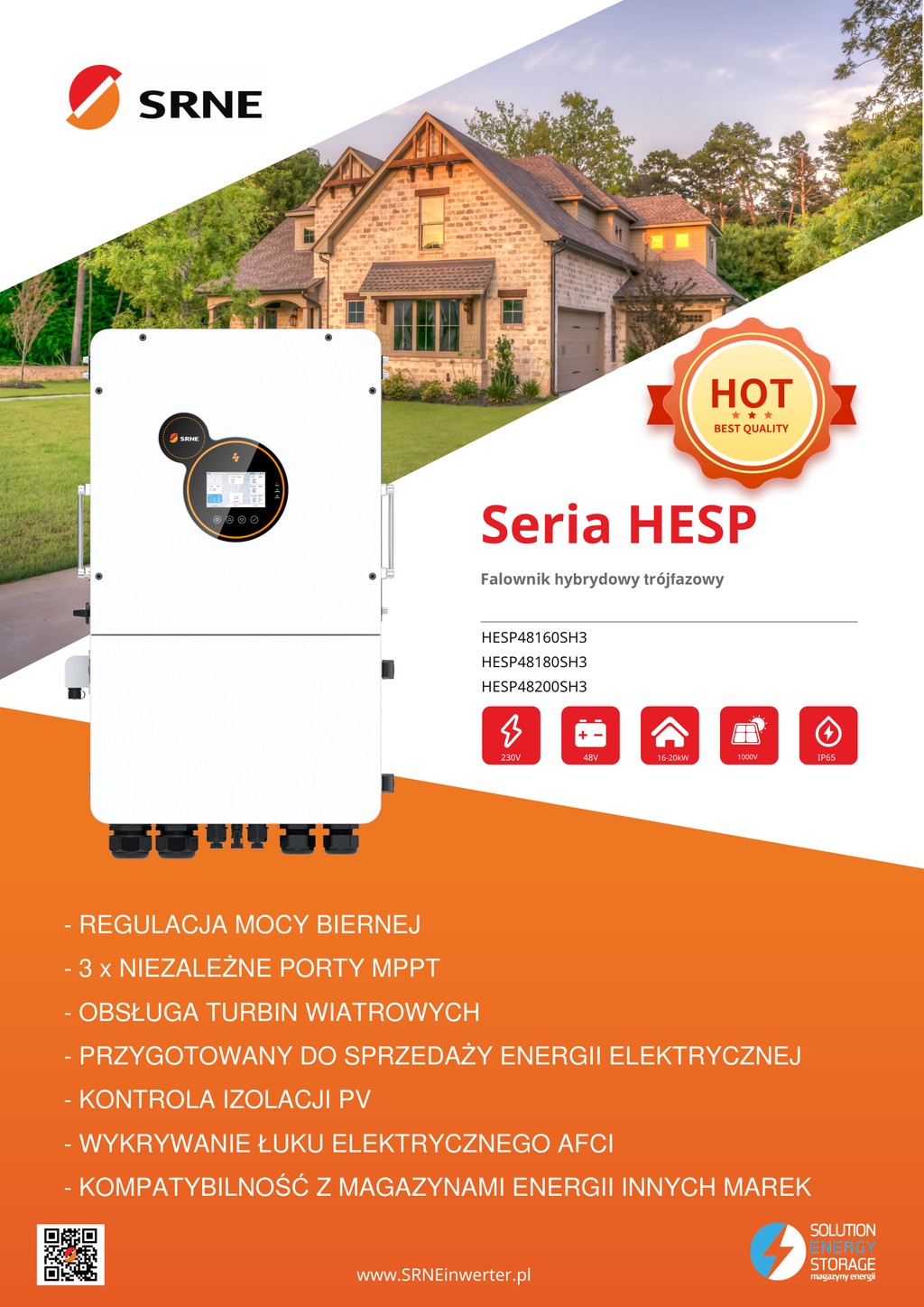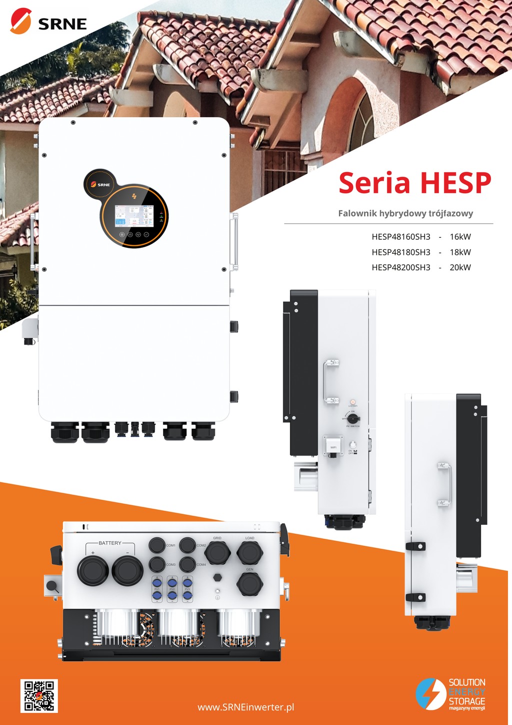 SRNE HESP48200SH3 to najmocniejszy trójfazowy inwerter hybrydowy z serii HESP pracujący z magazynami energii 48 V. Oferuje aż 20 kW mocy wyjściowej, obsługę trybów on-grid, off-grid oraz awaryjnego EPS, a także dwa niezależne trackery MPPT o wysokiej sprawności. Przeznaczony jest do dużych instalacji domowych, komercyjnych i przemysłowych, które wymagają dużej niezawodności i stabilnej pracy przy dużym obciążeniu.