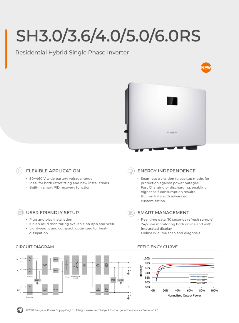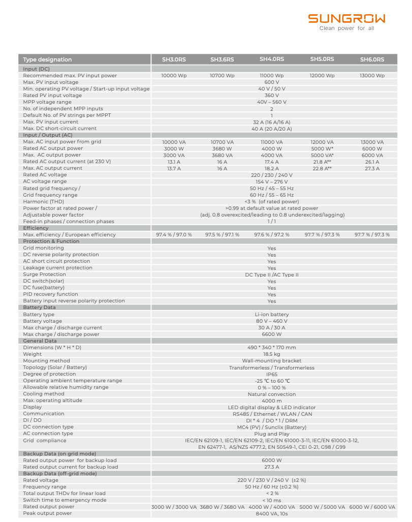 Sungrow SH3.0RS / SH3.6RS / SH4.0RS / SH5.0RS / SH6.0RS to niezawodny i efektywny falownik hybrydowy, który stanowi kluczowy element nowoczesnego systemu fotowoltaicznego. Dzięki zaawansowanym funkcjom i łatwości obsługi, zapewnia optymalne zarządzanie energią, zwiększa autokonsumpcję i gwarantuje niezależność energetyczną. Wybór tego falownika to inwestycja w przyszłość Twojego domu.