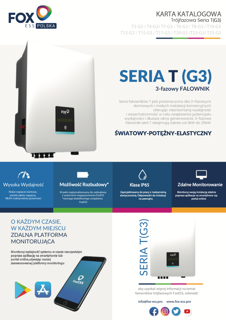 Falownik FoxESS T3-T25 G3 to urządzenie o wysokiej sprawności, osiągającej maksymalnie 98,6%. Wykorzystanie beztransformatorowej konstrukcji pozwoliło na uzyskanie kompaktowych wymiarów i ułatwia montaż. Klasa ochrony IP65 zapewnia odporność na kurz i wodę, umożliwiając montaż zarówno wewnątrz, jak i na zewnątrz budynków. Dzięki możliwości zdalnego monitorowania za pomocą aplikacji mobilnej lub portalu online, użytkownik ma stały dostęp do informacji o wydajności swojego systemu fotowoltaicznego. Falownik obsługuje także różne protokoły komunikacyjne, w tym Wi-Fi, co ułatwia integrację z istniejącymi systemami zarządzania energią.
