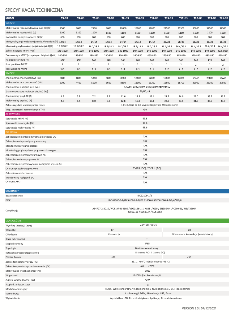 Falownik trójfazowy FoxESS T3-T25 G3 to kompleksowe rozwiązanie dla nowoczesnych systemów fotowoltaicznych. Łączy on w sobie wysoką wydajność, elastyczność instalacyjną oraz zaawansowane funkcje monitorowania i bezpieczeństwa. Dzięki szerokiemu zakresowi mocy i możliwości dostosowania do różnych potrzeb, jest to idealny wybór dla każdego, kto poszukuje niezawodnego i efektywnego falownika do swojej instalacji PV. Zdalne monitorowanie zapewnia stały wgląd w parametry pracy, a solidna konstrukcja i wysoka klasa ochrony gwarantują długotrwałą i bezproblemową eksploatację.