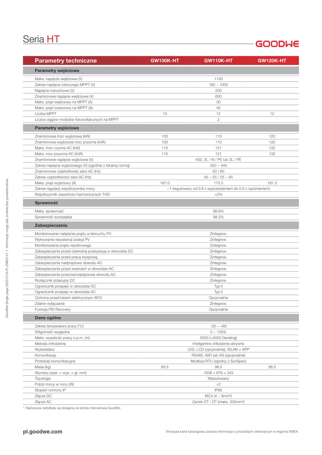 GoodWe ET GW100K-HT to wysokiej mocy trójfazowy inwerter sieciowy przeznaczony do dużych instalacji fotowoltaicznych w sektorze komercyjnym i przemysłowym. Urządzenie z serii HT zostało zaprojektowane z myślą o maksymalnej wydajności, wysokiej niezawodności oraz elastyczności projektowej, umożliwiając efektywną pracę z nowoczesnymi modułami PV o dużych prądach roboczych.