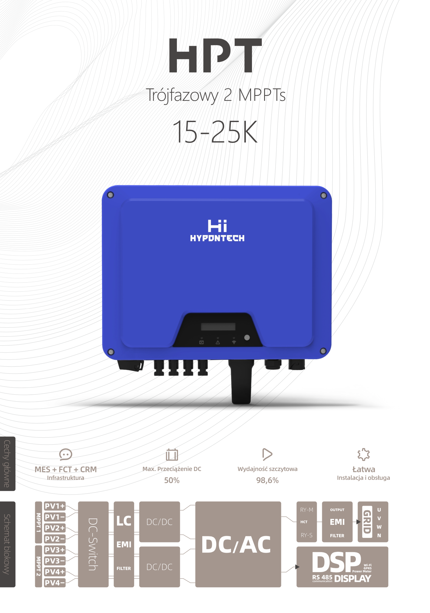 Najnowsza seria HPT obejmuje modele o mocach od 15 kW do 25 kW z możliwością chwilowego przeciążania DC aż do 50%. Falowniki z serii HPT charakteryzują się nowoczesną konstrukcją opartą na podzespołach elektronicznych renomowanych producentów, takich jak Fujitsu czy Texas Instruments. Wykorzystanie komponentów wysokiej jakości przekłada się na niską masę urządzeń oraz ich wysoką niezawodność. Konstrukcja falowników HPT zapewnia wysoką efektywność i długotrwałą pracę w różnorodnych warunkach.