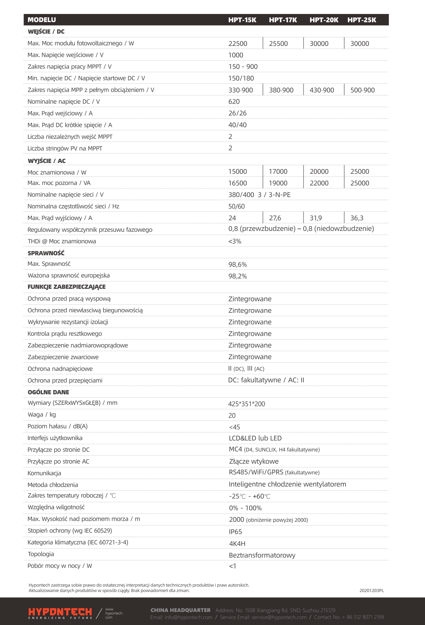 Poniższa tabela przedstawia szczegółowe dane techniczne inwerterów serii HPT (przykładowe dane):