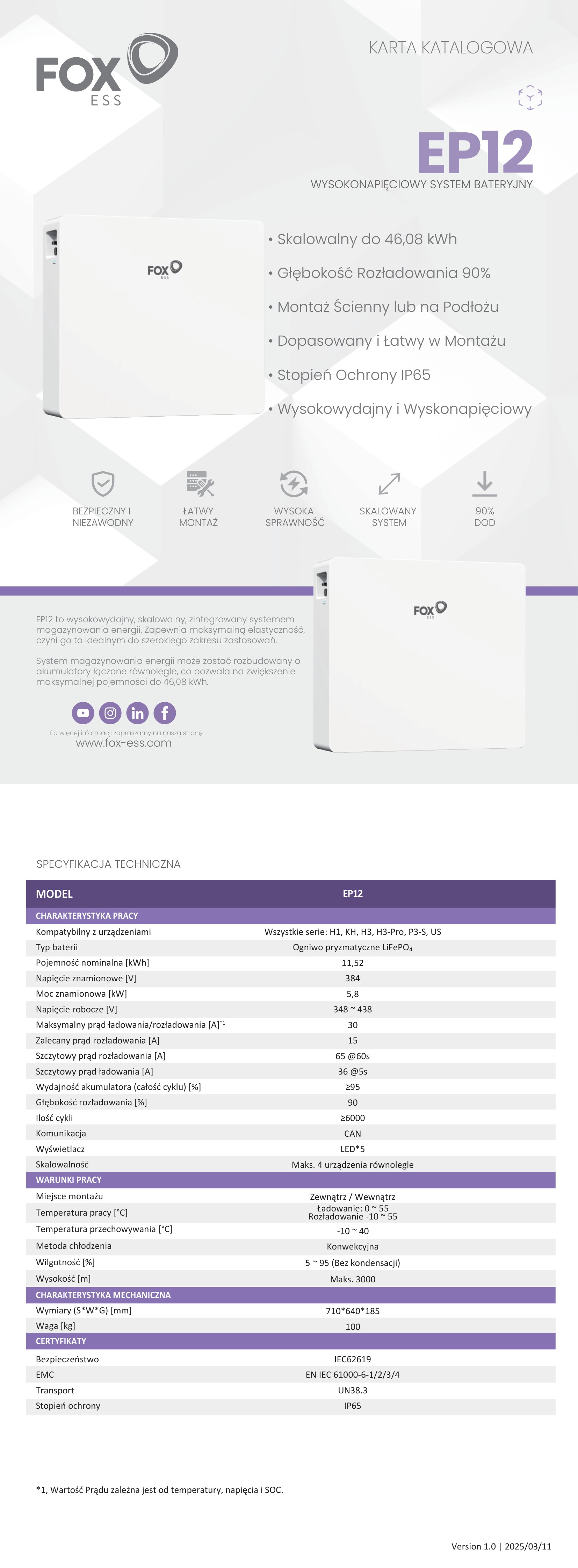 FoxESS EP12 HV to wysokonapięciowy magazyn energii w technologii LFP (LiFePO₄) o pojemności nominalnej 11,52 kWh i głębokości rozładowania 90% DoD. System jest skalowalny (możliwość pracy równoległej), zapewnia wysoką sprawność cyklu oraz dzięki klasie szczelności IP65 sprawdza się zarówno w instalacjach domowych, jak i komercyjnych.