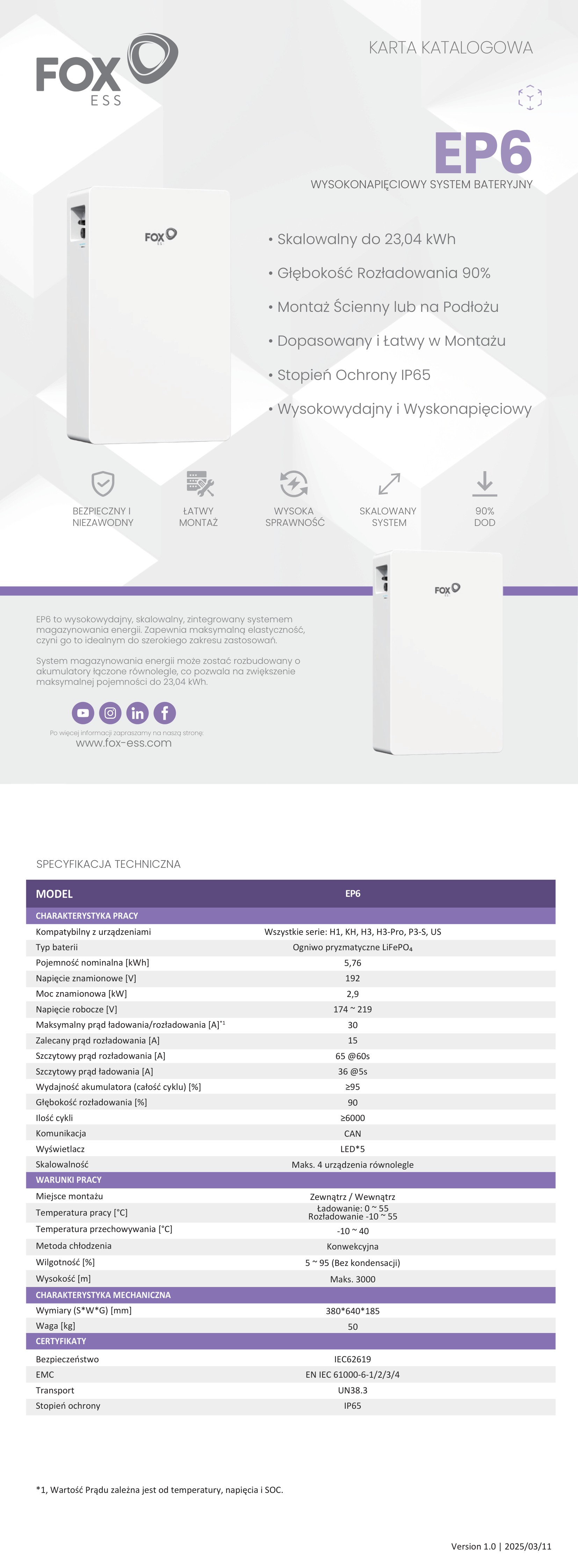FoxESS EP6 HV to wysokonapięciowy magazyn energii w technologii LFP (LiFePO₄) o pojemności nominalnej 5,76 kWh i głębokości rozładowania 90% DoD. System jest skalowalny i może pracować w konfiguracjach rozbudowanych (równolegle), a dzięki stopniowi ochrony IP65 oraz możliwości montażu na podłożu lub na ścianie sprawdza się zarówno w instalacjach domowych, jak i komercyjnych.