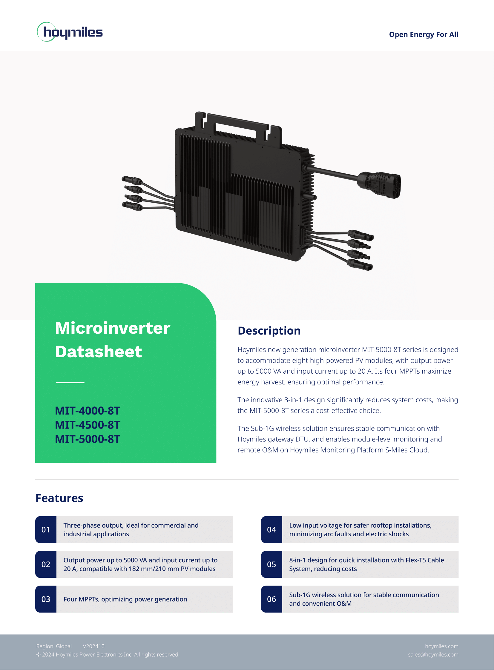 Nowej generacji mikroinwerter Hoymiles serii MIT w wersji MIT-5000-8T został zaprojektowany do obsługi ośmiu modułów fotowoltaicznych o dużej mocy. Oferuje wyjście trójfazowe, do 5000 VA mocy znamionowej oraz wejściowy prąd do 20 A (na ścieżkę), dzięki czemu świetnie sprawdza się w zastosowaniach komercyjnych i przemysłowych.