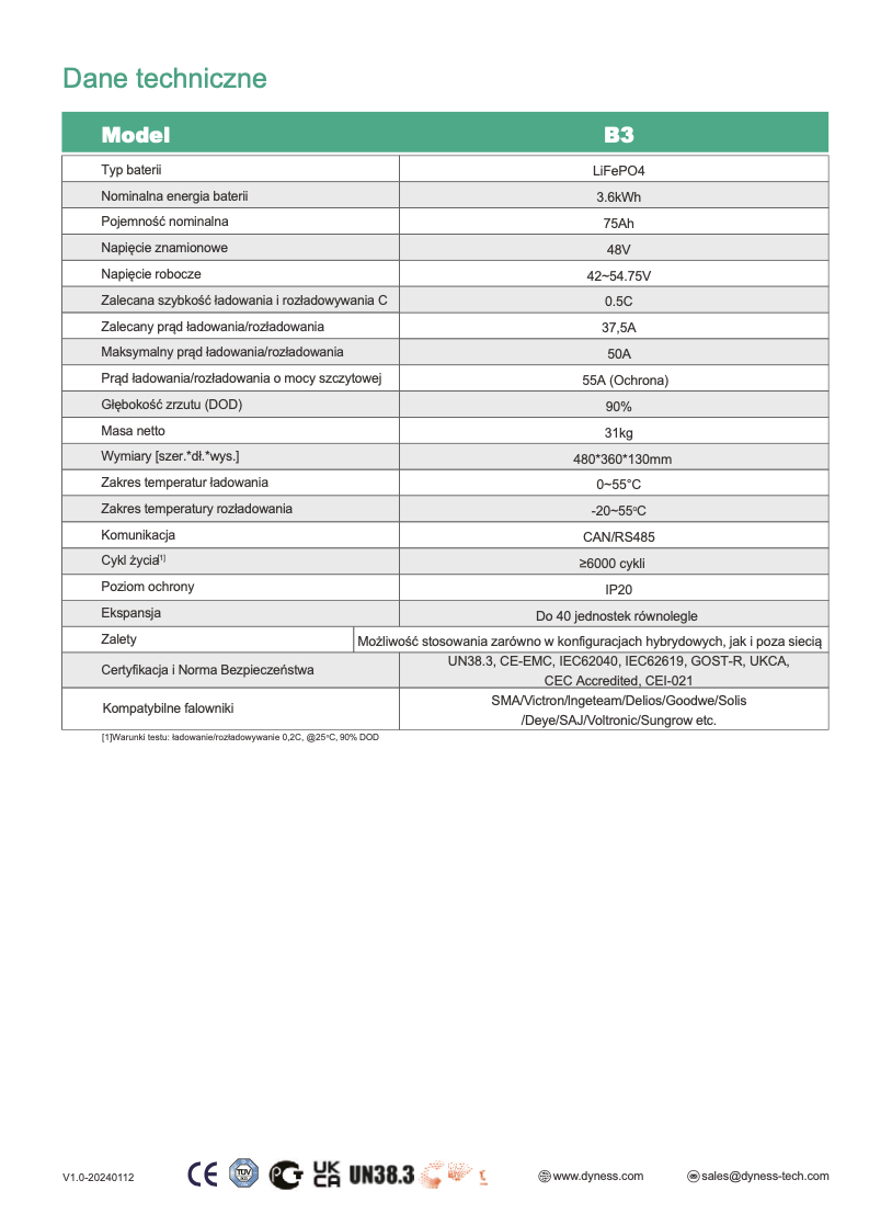 • Technologia ogniw: LiFePO4, zapewniająca bezpieczeństwo i ponad 6000 cykli żywotności.