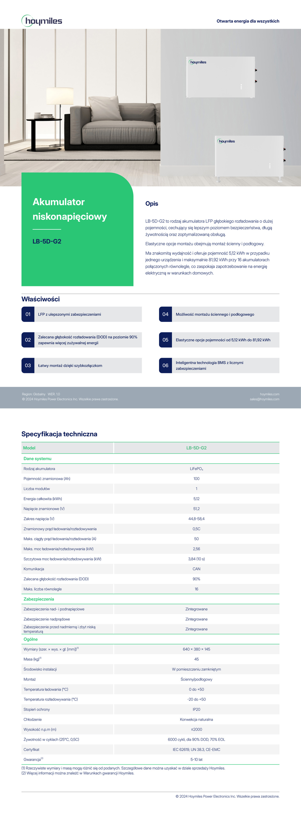 Hoymiles LB-5D-G2 to niskonapięciowy (LV) moduł magazynu energii oparty na ogniwach LiFePO4, o pojemności 5,12 kWh, napięciu znamionowym 51,2 V DC i pojemności 100 Ah. Moduł przeznaczony jest do współpracy z magazynowymi falownikami niskonapięciowymi (48 V) w instalacjach domowych i małych komercyjnych. Konstrukcja pozwala na równoległe łączenie do 16 sztuk (do 81,92 kWh łącznie), montaż na ścianie lub na podłodze oraz integrację z systemem Hoymiles (falownik + magazyn energii + S-Miles Cloud). Zastosowana chemia LFP i zalecana głębokość rozładowania 90 % zapewniają trwałość rzędu 6000+ cykli przy temperaturze 25 °C.