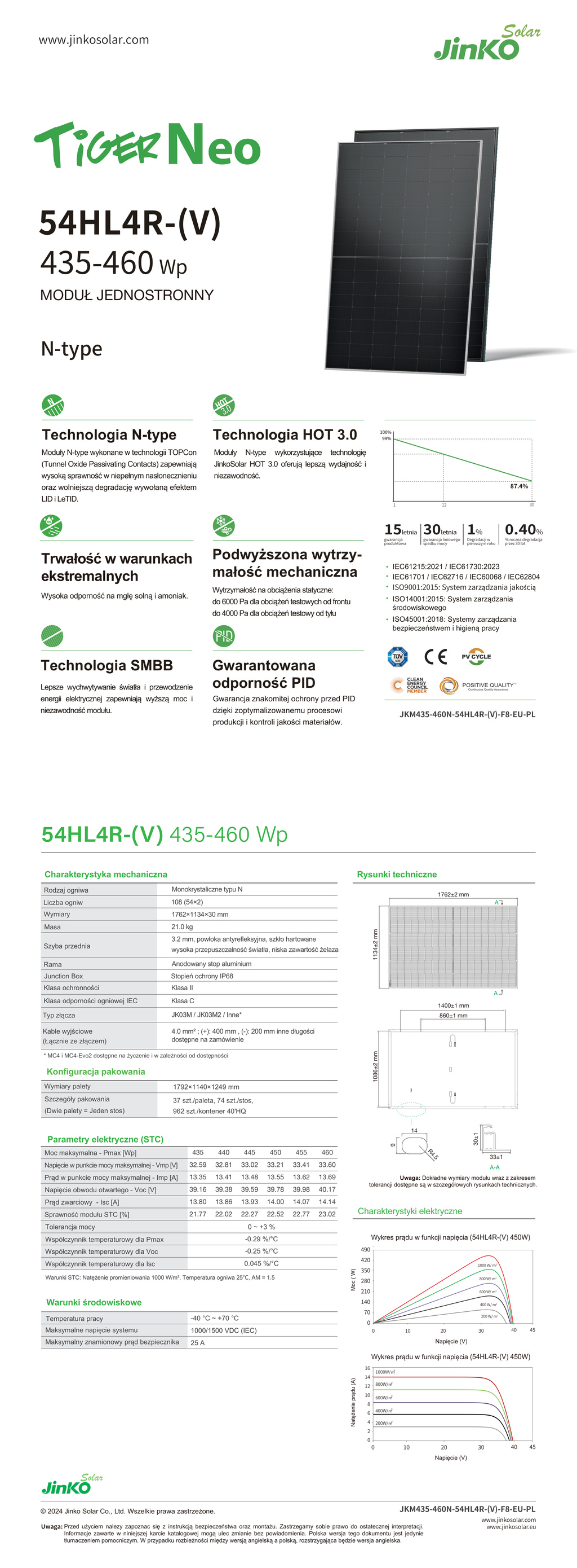 Jinko Solar JKM455N-54HL4R-V 455 W BF to nowoczesny moduł fotowoltaiczny oparty na technologii ogniw typu N (TOPCon).