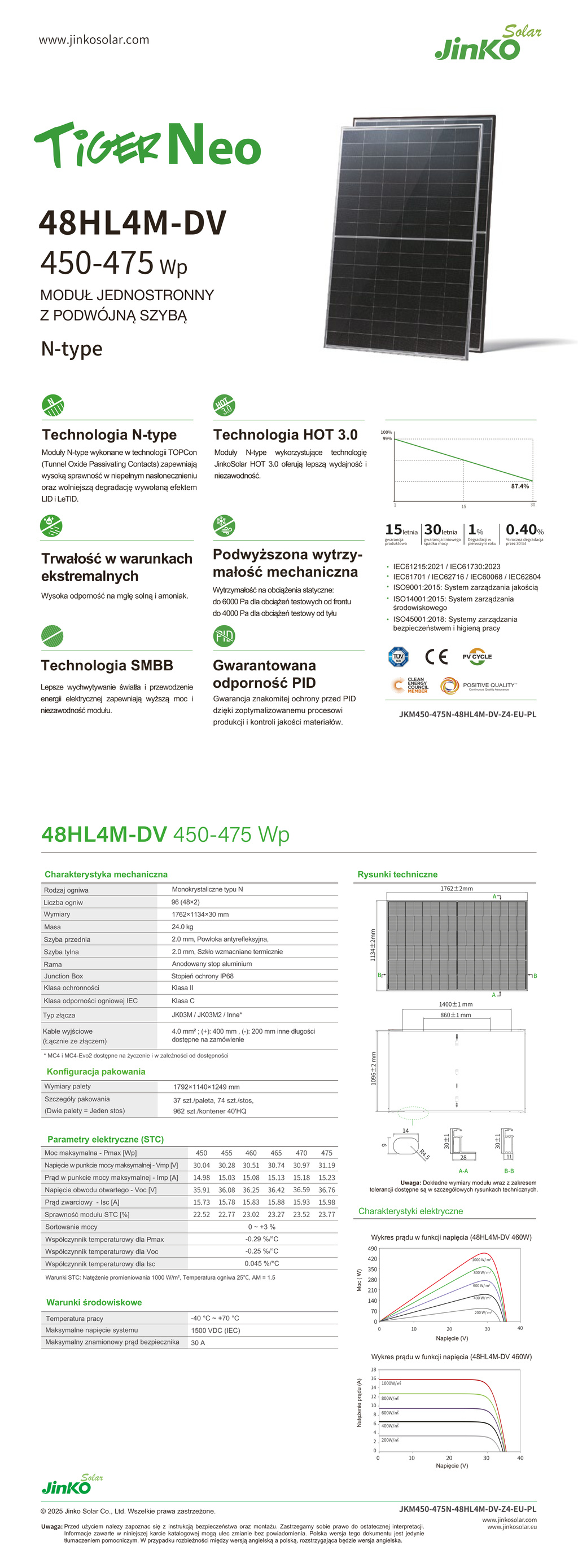 Jinko Solar JKM460-48HL4M-DV to nowoczesny moduł fotowoltaiczny z podwójną szybą, oparty na technologii monokrystalicznych ogniw N-type.