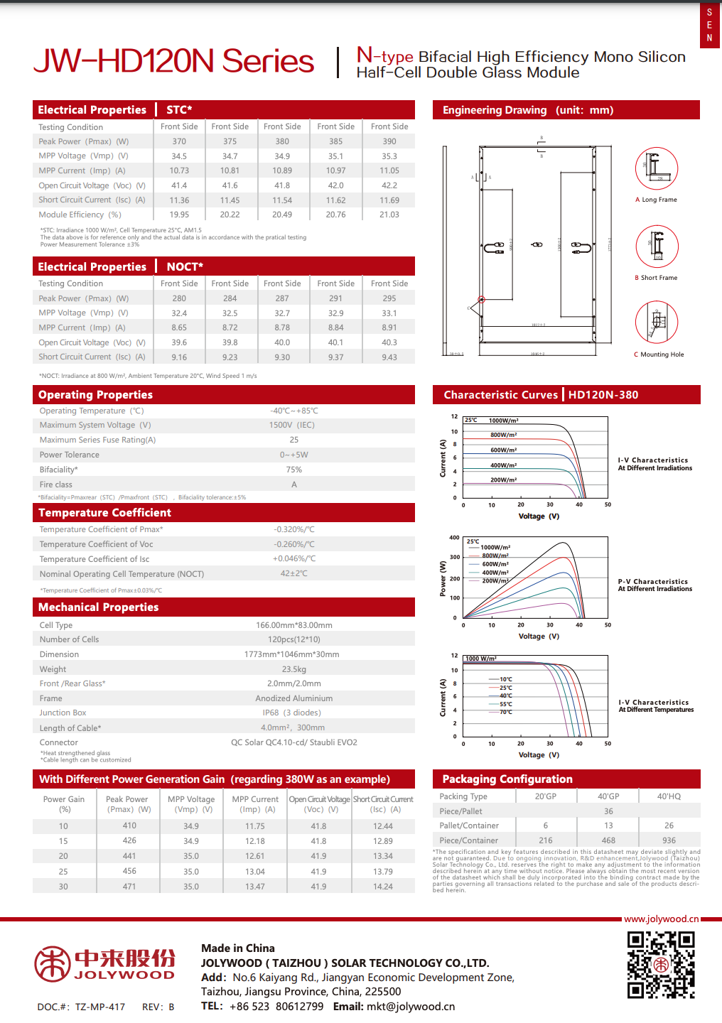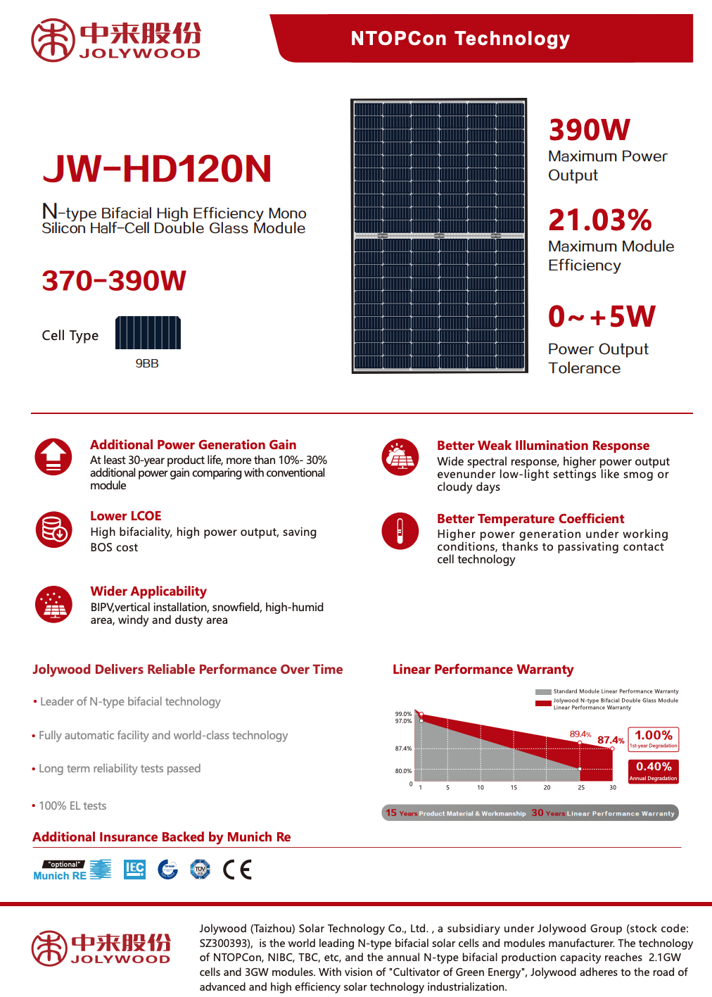 Firma Jolywood jest wiodącym producentem specjalizującym się w bifacialnych modułach fotowoltaicznych na świecie. Jolywood została umieszczona na liście TIer 1 przez Bloomberg New Energy Finance. Do końca 2022 roku spółka Jolywood dostarczyła do ponad 50 krajów moduły słoneczne typu N o mocy ponad 6,6 GW. Dwustronny panel fotowoltaiczny Jolywood JW-HD120N-390W to gwarancja wysokiej jakości, niezawodności i wytrzymałości zapewnionej przez zaawansowane rozwiązania technologiczne Jolywood.