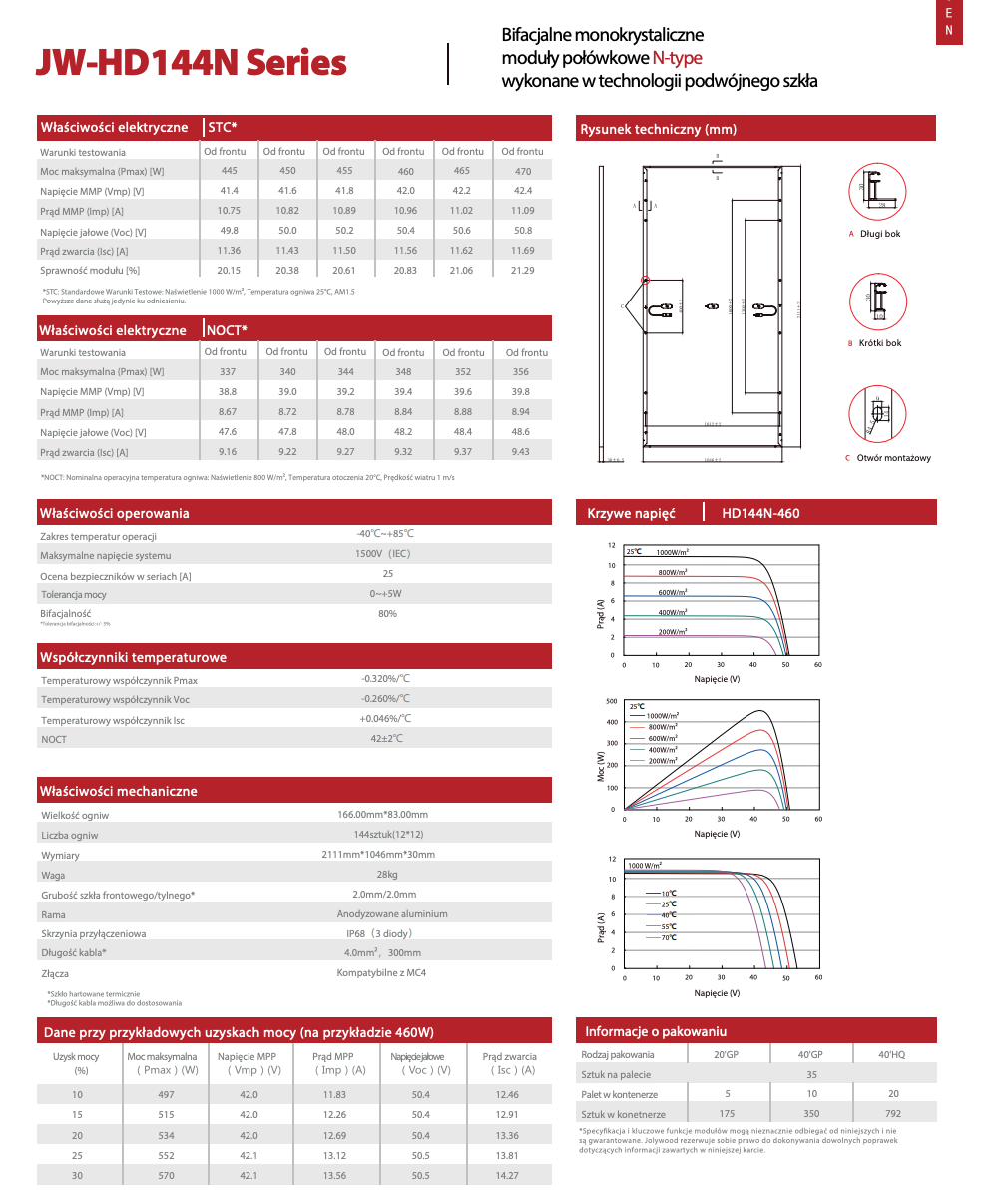 Bifacjalny moduł fotowoltaiczny Jolywood 460W JW-HD144N-460W charakteryzują:
