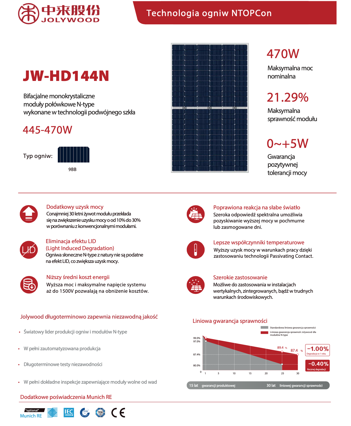 Firma Jolywood jest wiodącym producentem specjalizującym się w bifacialnych modułach fotowoltaicznych na świecie. Jolywood została umieszczona na liście TIer 1 przez Bloomberg New Energy Finance. Do końca 2022 roku spółka Jolywood dostarczyła do ponad 50 krajów moduły słoneczne typu N o mocy ponad 6,6 GW. Dwustronny panel fotowoltaiczny Jolywood JW-HD144N-460W to gwarancja wysokiej jakości, niezawodności i wytrzymałości zapewnionej przez zaawansowane rozwiązania technologiczne Jolywood.