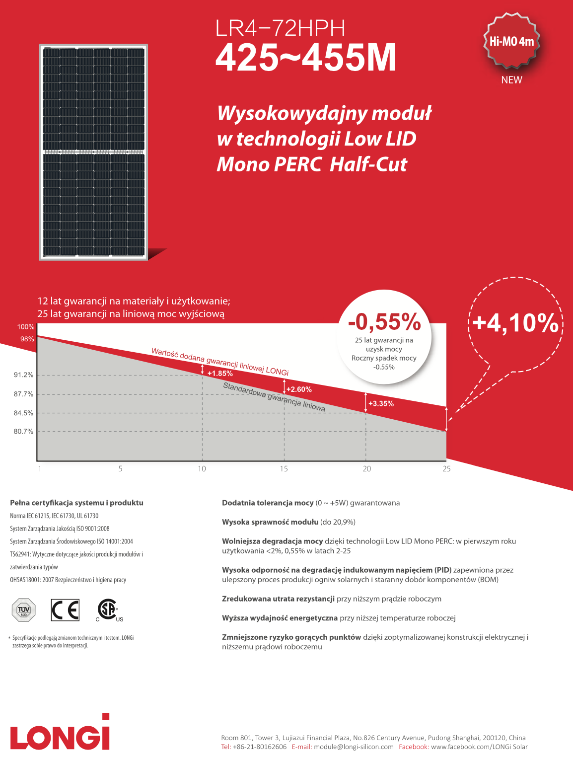 LONGi Solar jest wiodącym dostawcą wysokiej sprawności modułów fotowoltaicznych. Zajmuje czołowe pozycje w prestiżowym zestawieniu TIER 1, które obejmuje najstabilniejszych i najbardziej godnych zaufania wytwórców paneli PV. Producent od ponad 20 lat skupia się na technologii monokrystalicznej co uczyniło go na rynku specjalistą  monokrystalicznych ogniw krzemowych. Panele słoneczne LONGi Solar, w tym moduł fotowoltaiczny LR4-72HPH-455M,  szczególnie ceni się za wysoką i potwierdzoną licznymi testami jakość przy zachowaniu stosunkowo niskich cen.