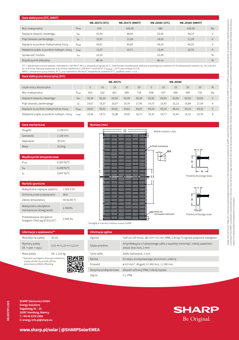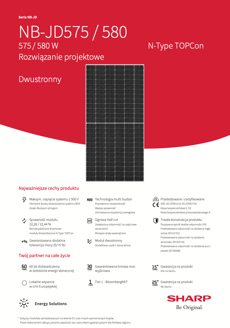Sharp to lider w branży fotowoltaicznej. Firma może poszczycić się najdłuższym w branży, ponad 50-letnim doświadczeniem opracowywania rozwiązań w zakresie modułów słonecznych. Sharp dzięki  dostarczeniu 50 milionów najnowocześniejszych paneli fotowoltaicznych tysiącom klientów na całym świecie łącznie wyprodukowała już ponad 15 GW zielonej energii. Dzięki ciągłym innowacją technologicznym i trwałej renomie na rynku, Sharp znalazło się na liście Bloomberga Tier 1 najbardziej godnych zaufania producentów paneli słonecznych. Ich moduł fotowoltaiczny 575 W NB-JD575 to gwarancja jakości i niezawodnego wytwarzania energii elektrycznej.