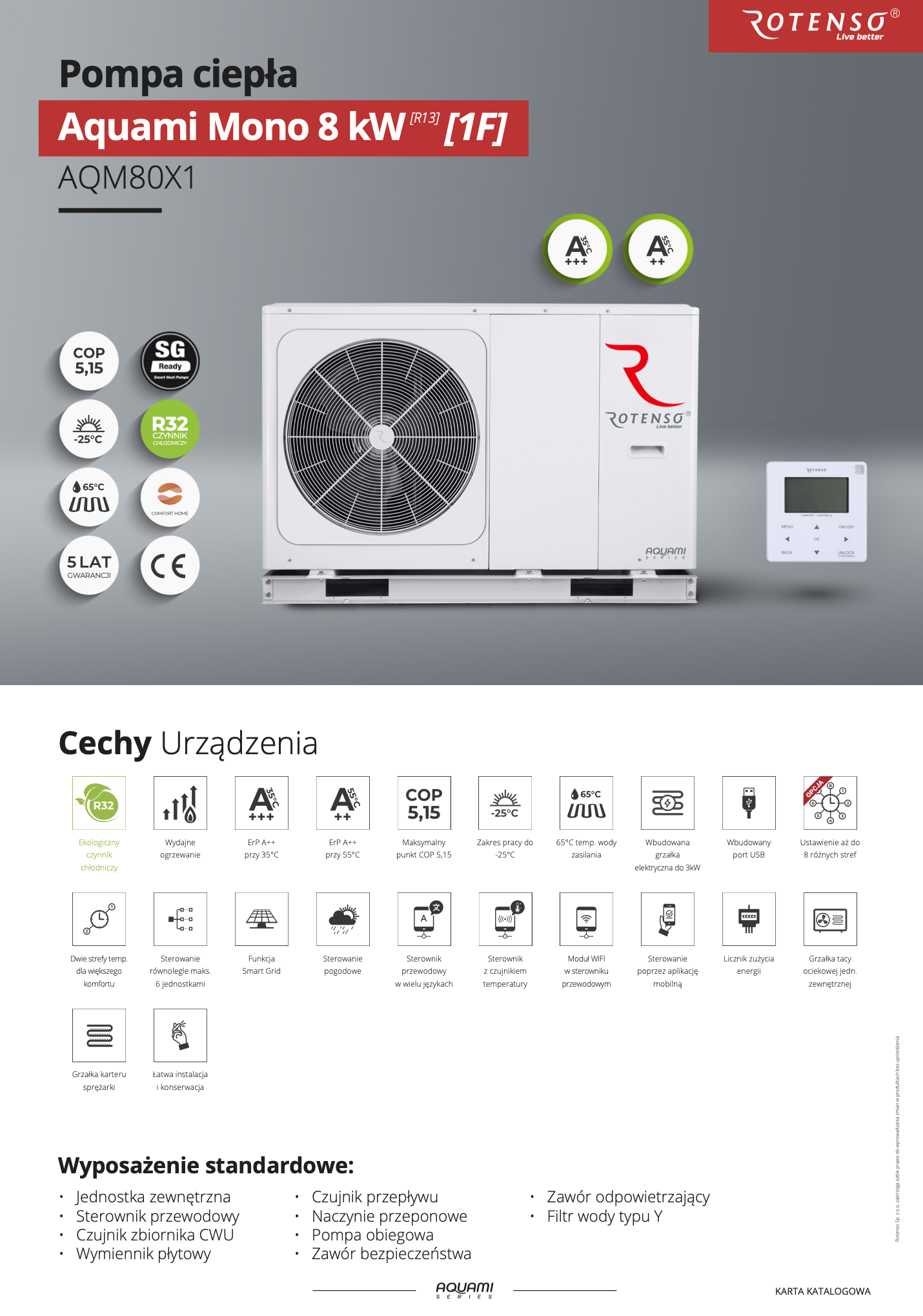 Rotenso Aquami Monoblock to pompy ciepła, w których moduł chłodniczy oraz hydrauliczny znajdują się w jednej, zwartej obudowie urządzenia. Ułatwia i przyspiesza to montaż pompy. Nie wymaga też przeznaczenia dodatkowego miejsca na moduł hydrauliczny wewnątrz budynku. Dwudrzwiowa konstrukcja obudowy pompy zapewnia łatwy dostęp do wszystkich jej elementów, a interfejs użytkownika – prostą i szybką zmianę parametrów oraz ich monitoring w czasie rzeczywistym. Nowoczesna konstrukcja Pomp Ciepła Rotenso i ich wysoka efektywność pracy również w niskich temperaturach sprawiają, że są one idealnym rozwiązaniem do ogrzewania domów, sklepów, lokali usługowych i biur.