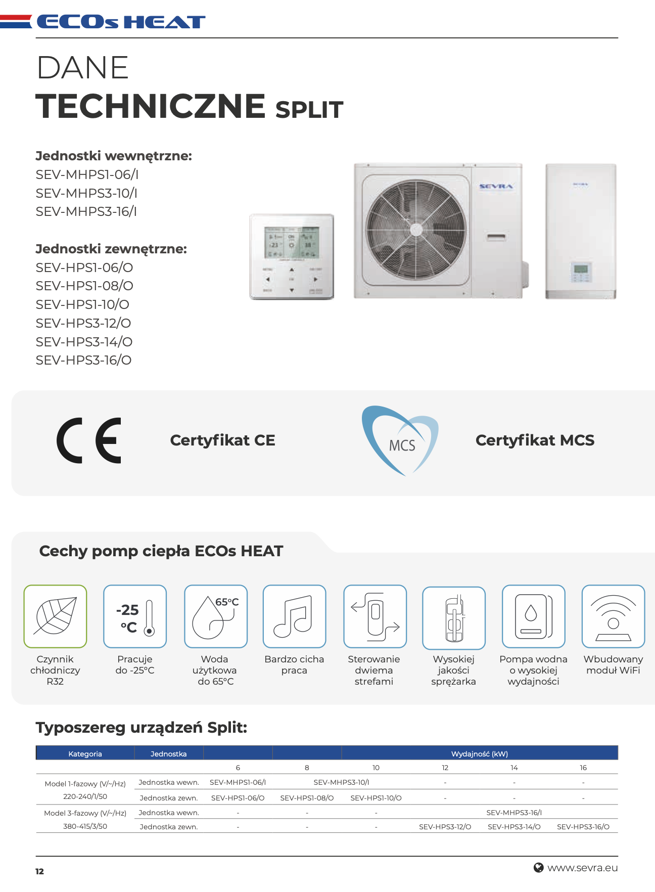 Pompa ciepła SEVRA Split SEV-MHPS3-16/I + SEV-HPS3-12/O 12kW