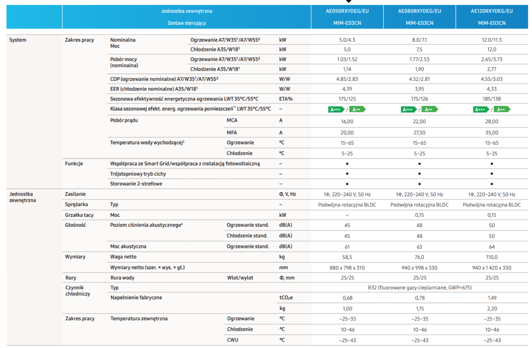 - Sterownik MWR-WW10N klasa energetyczna chłodzenia A++ klasa energetyczna grzania A+++ wbudowana grzałka tacy ociekowe, Grzanie do -25 stopni