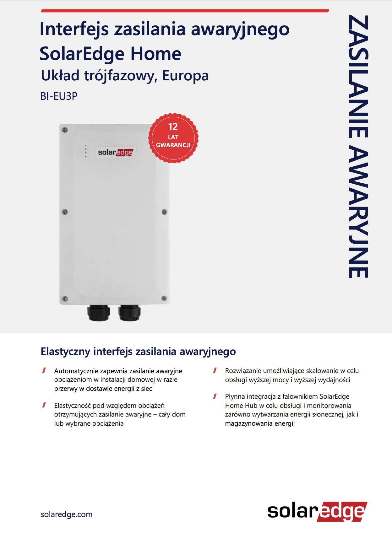 Moduł zasilania rezerwowego dla falowników 3-fazowych SolarEdge serii RWB48, jest automatycznym systemem zapewniającym zasilanie awaryjne strategicznym odbiornikom w instalacji domowej, w razie przerwy lub awarii dostaw energii z sieci. SE BACKUP Charakteryzuje się elastycznością pod względem obciążeń faz outrzymujących zasilanie awaryjne – cały dom lub wybrane obwody. Zapewnia płynną integracje z falownikiem SolarEdge Home Hub w celu obsługi i monitorowania zarówno wytwarzania/zużycia energii słonecznej, jak również jej magazynowania.
