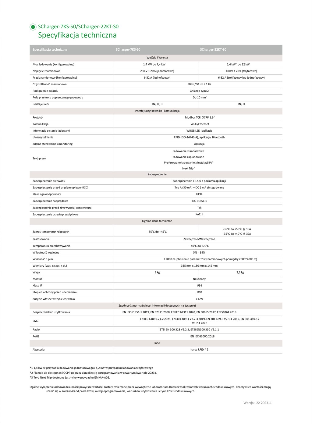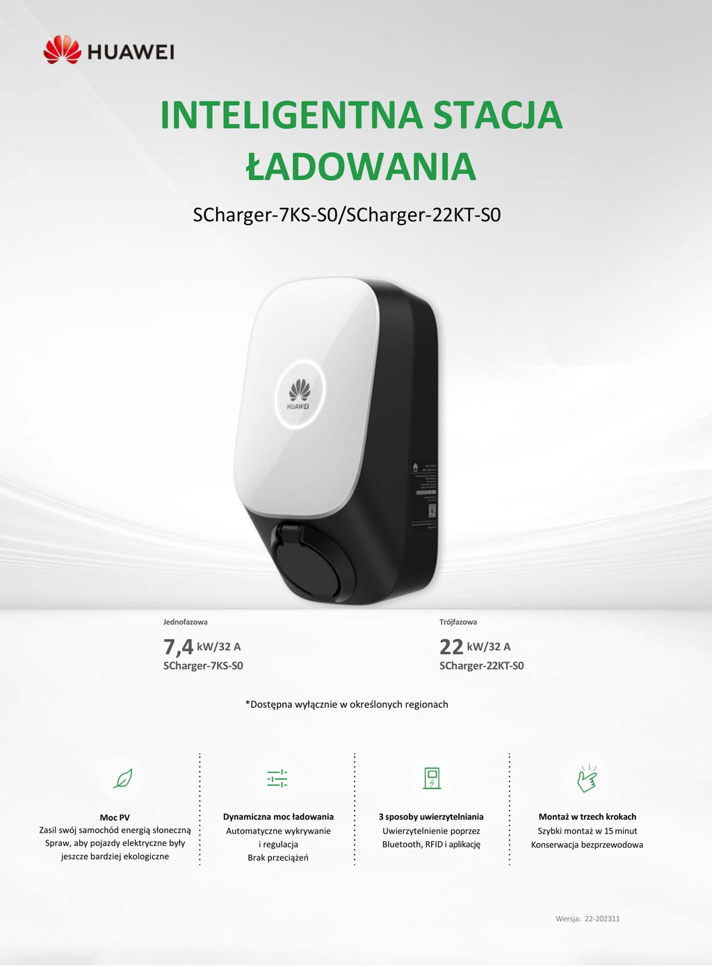 Huawei SCHARGER-22KT-S0 to nowoczesna trójfazowa stacja ładowania pojazdów elektrycznych AC o mocy do 22 kW, zaprojektowana do zastosowań domowych, komercyjnych oraz flotowych. Urządzenie w pełni integruje się z ekosystemem Huawei FusionSolar, umożliwiając inteligentne ładowanie, dynamiczne zarządzanie mocą oraz bezpieczną i wygodną obsługę użytkowników.