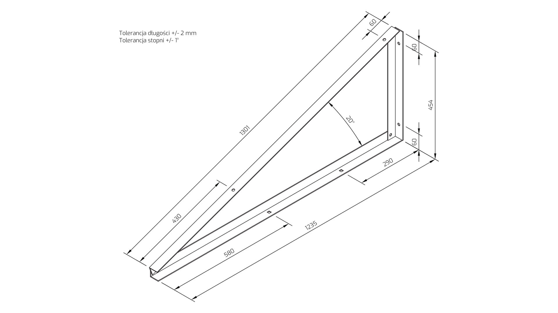 Trójkąt montażowy do konstrukcji bezinwazyjnej (balastowej). W ułożeniu paneli pionowym. O kącie nachylenia 20 stopni. Materiał : aluminium